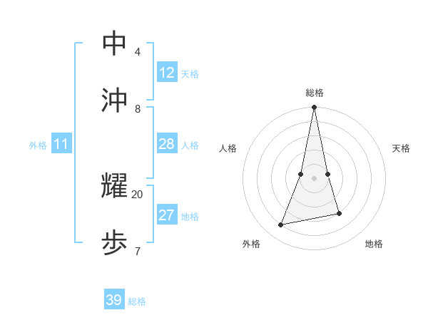 中沖 耀歩さんの総格は39画の5点!