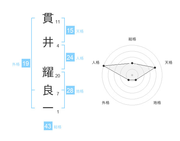 貫井 耀良一さんの総格は43画の2点!