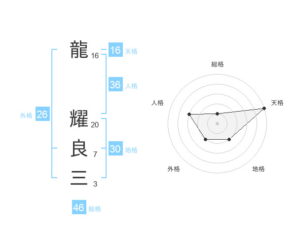 龍 耀良三さんの総格は46画の1点!