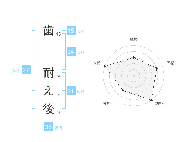 歯 耐え後さんの総格は36画の3点!