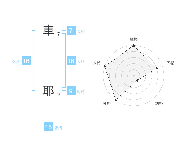 車 耶さんの外格は16画の5点!