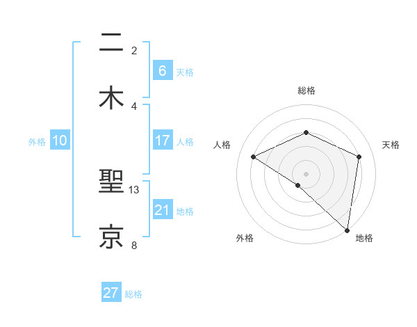 二木 聖京さんの総格は27画の3点!