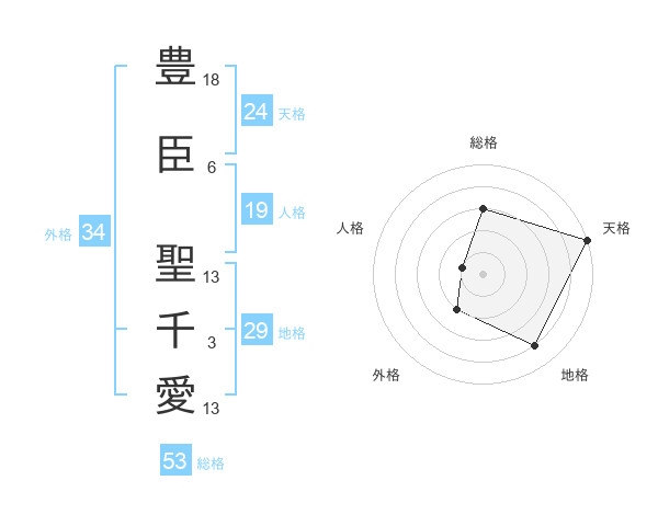豊臣 聖千愛さんの総格は53画の3点!