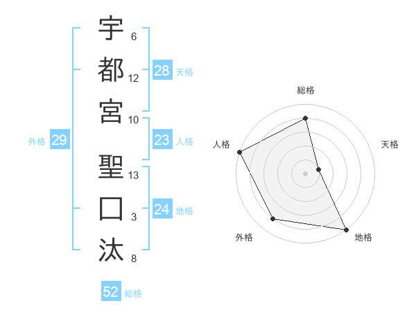 宇都宮 聖囗汰さんの総格は52画の4点!