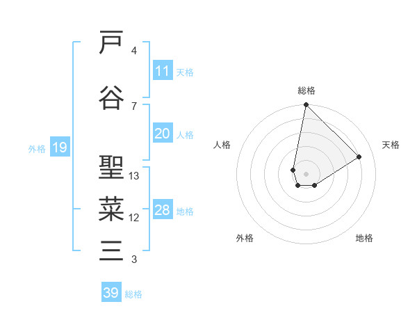 戸谷 聖菜三さんの総格は39画の5点!