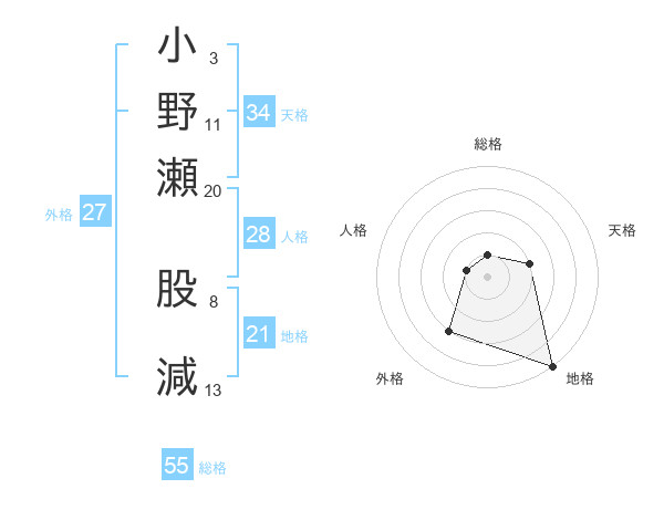 小野瀬 股減さんを姓名の画数から五運を鑑定