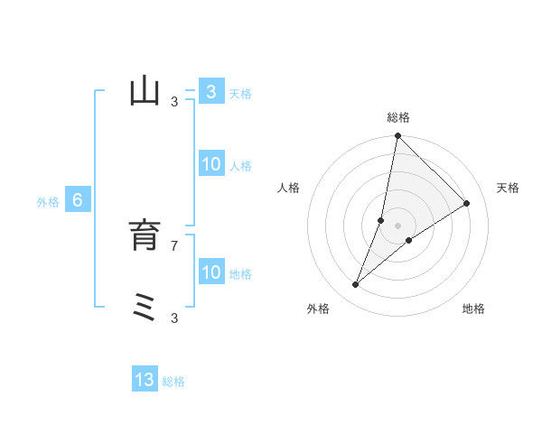 山 育ミさんの総格は13画の5点!