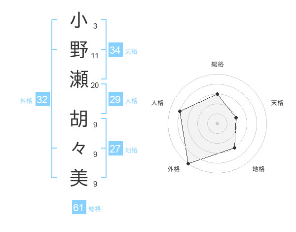 小野瀬 胡々美さんの総格は61画の3点!