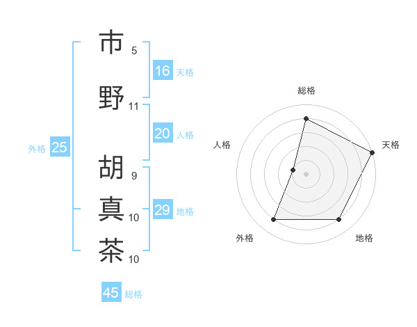 市野 胡真茶さんの総格は45画の4点!
