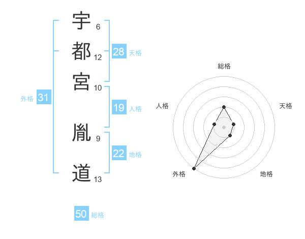 宇都宮 胤道さんを姓名の画数から五運を鑑定