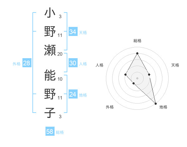 小野瀬 能野子さんを姓名の画数から五運を鑑定