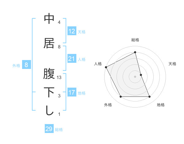中居 腹下しさんの総格は29画の4点!