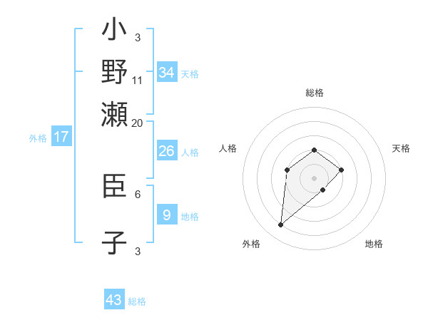 小野瀬 臣子さんを姓名の画数から五運を鑑定