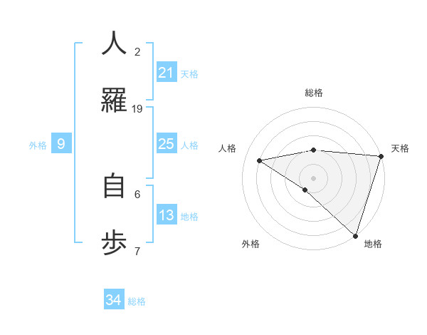 人羅 自歩さんの天格は21画の5点!