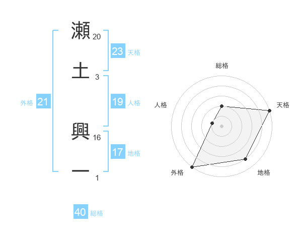 瀬土 興一さんの天格は23画の5点!