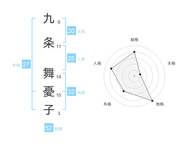 九条 舞憂子さんの総格は52画の4点!