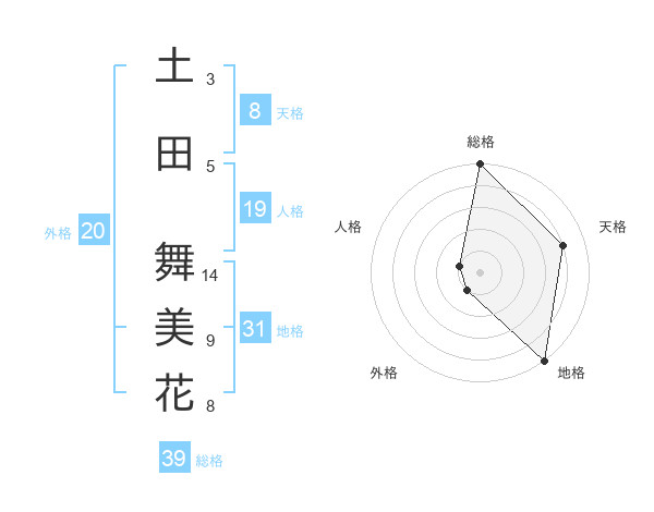 土田 舞美花さんの総格は39画の5点