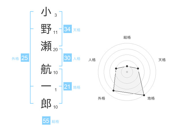小野瀬 航一郎さんの地格は21画の5点!