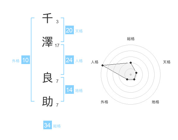 千澤 良助さんの総格は34画の2点!