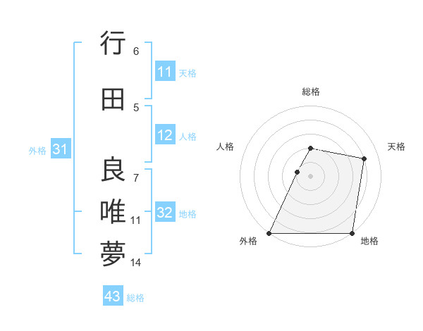行田 良唯夢さんを姓名の画数から五運を鑑定