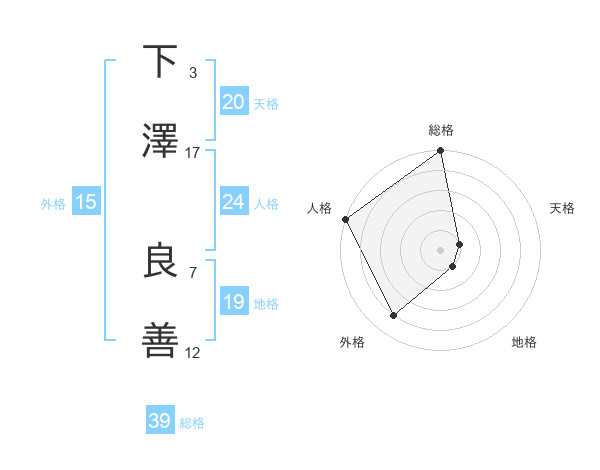 下澤 良善さんの総格は39画の5点!