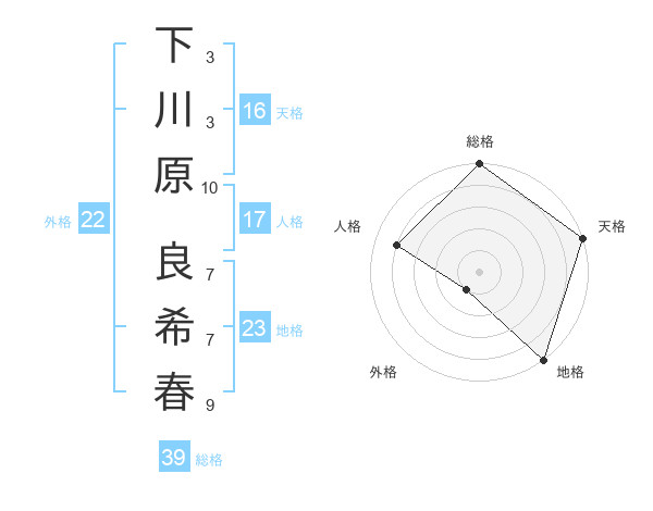 下川原 良希春さんの総格は39画の5点!