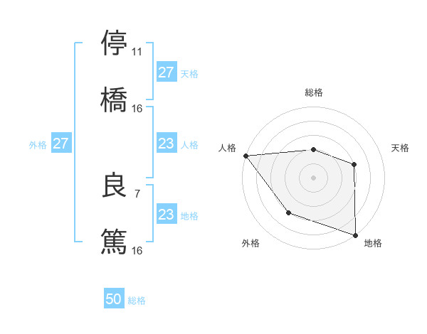停橋 良篤さんの総格は50画の2点!
