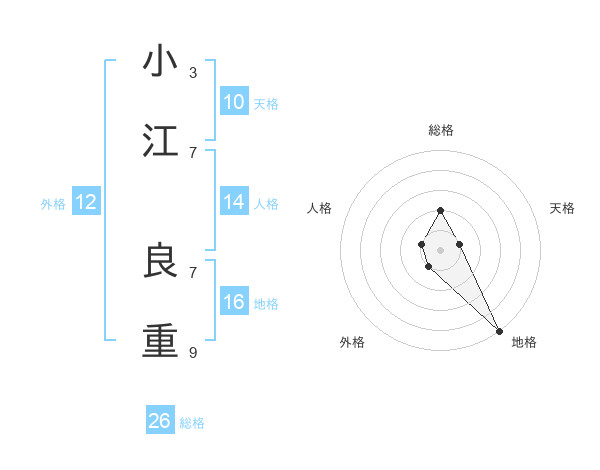 小江 良重さんの総格は26画の2点!