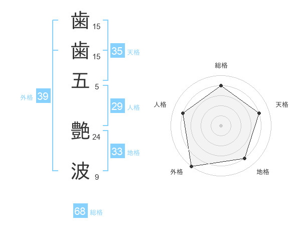 歯歯五 艶波さんの外格は39画の5点!