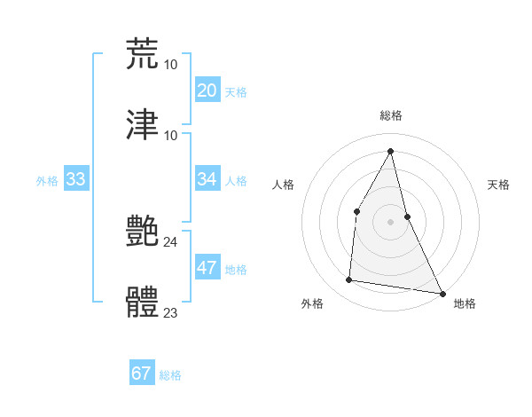 荒津 艶體さんの総格は67画の4点!