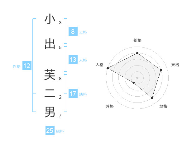 小出 芙二男さんの総格は25画の4点!