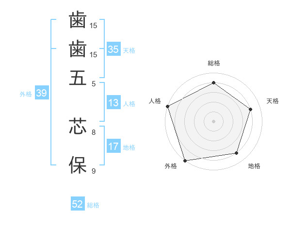 歯歯五 芯保さんの外格は39画の5点!