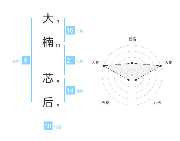大楠 芯后さんの天格は16画の5点!