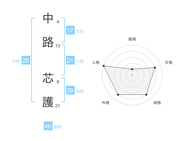 中路 芯護さんの天格は17画の4点!