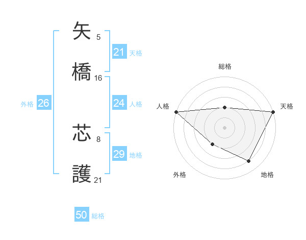 矢橋 芯護さんの天格は21画の5点!