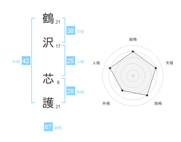 鶴沢 芯護さんの総格は67画の4点!