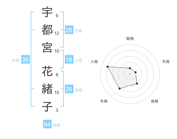 宇都宮 花緒子さんの総格は54画の1点!
