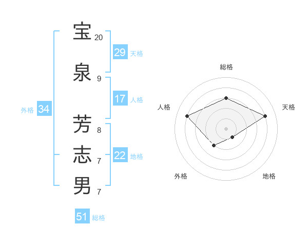 宝泉 芳志男さんの総格は51画の3点!