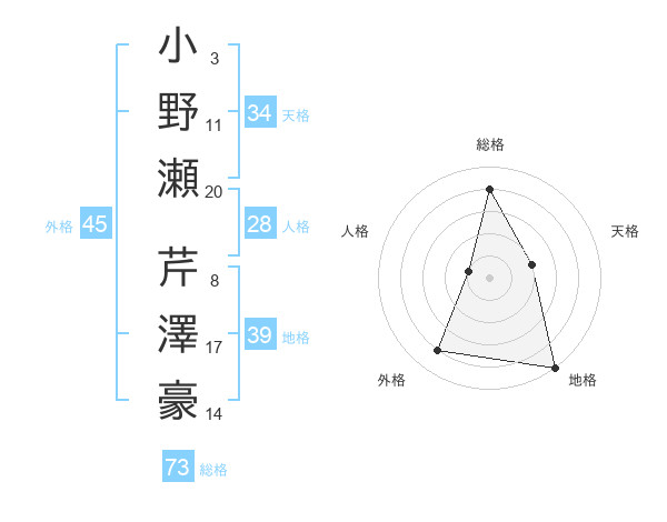 小野瀬 芹澤豪さんの総格は73画の4点