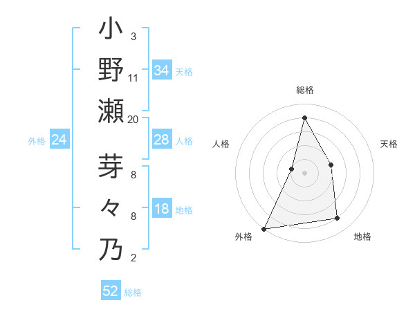 小野瀬 芽々乃さんを姓名の画数から五運を鑑定