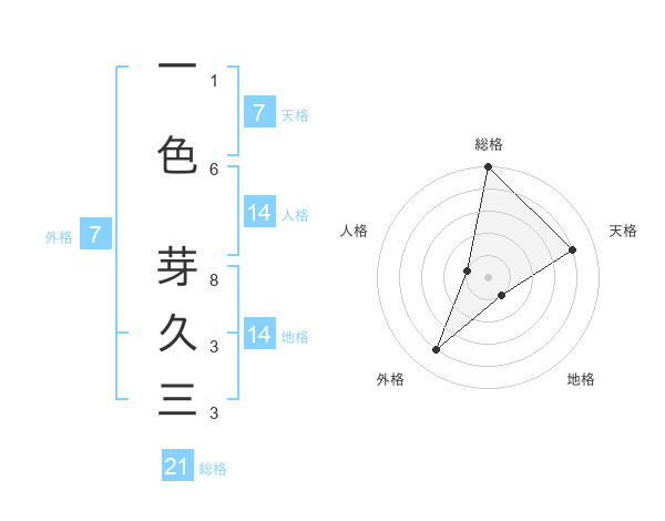 一色 芽久三さんの総格は21画の5点!