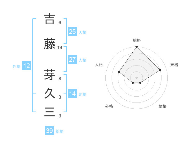 吉藤 芽久三さんの総格は39画の5点!