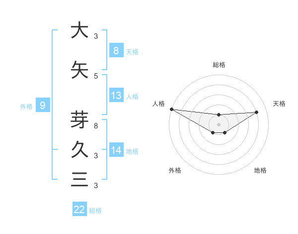 大矢 芽久三さんを姓名の画数から五運を鑑定