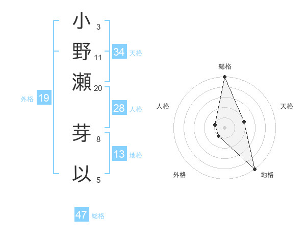 小野瀬 芽以さんの総格は47画の5点!