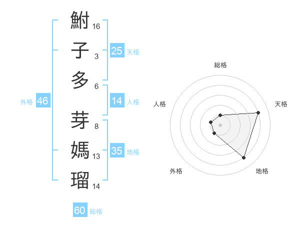 鮒子多 芽媽瑠さんの外格は46画の1点!
