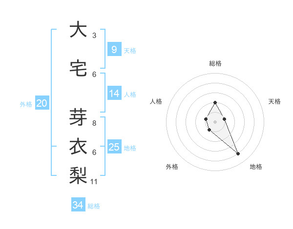 大宅 芽衣梨さんを姓名の画数から五運を鑑定