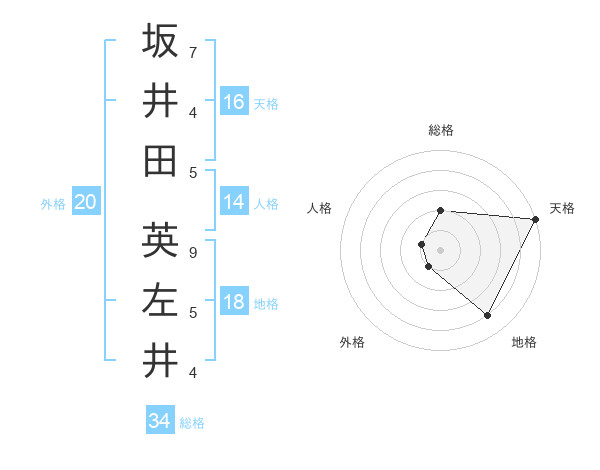 坂井田 英左井さんの総格は34画の2点!