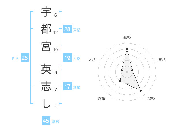 宇都宮 英志しさんの総格は45画の4点!