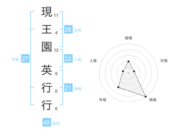 現王園 英行行さんの総格は49画の2点!