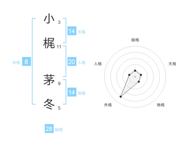 小梶 茅冬さんの総格は28画の1点!